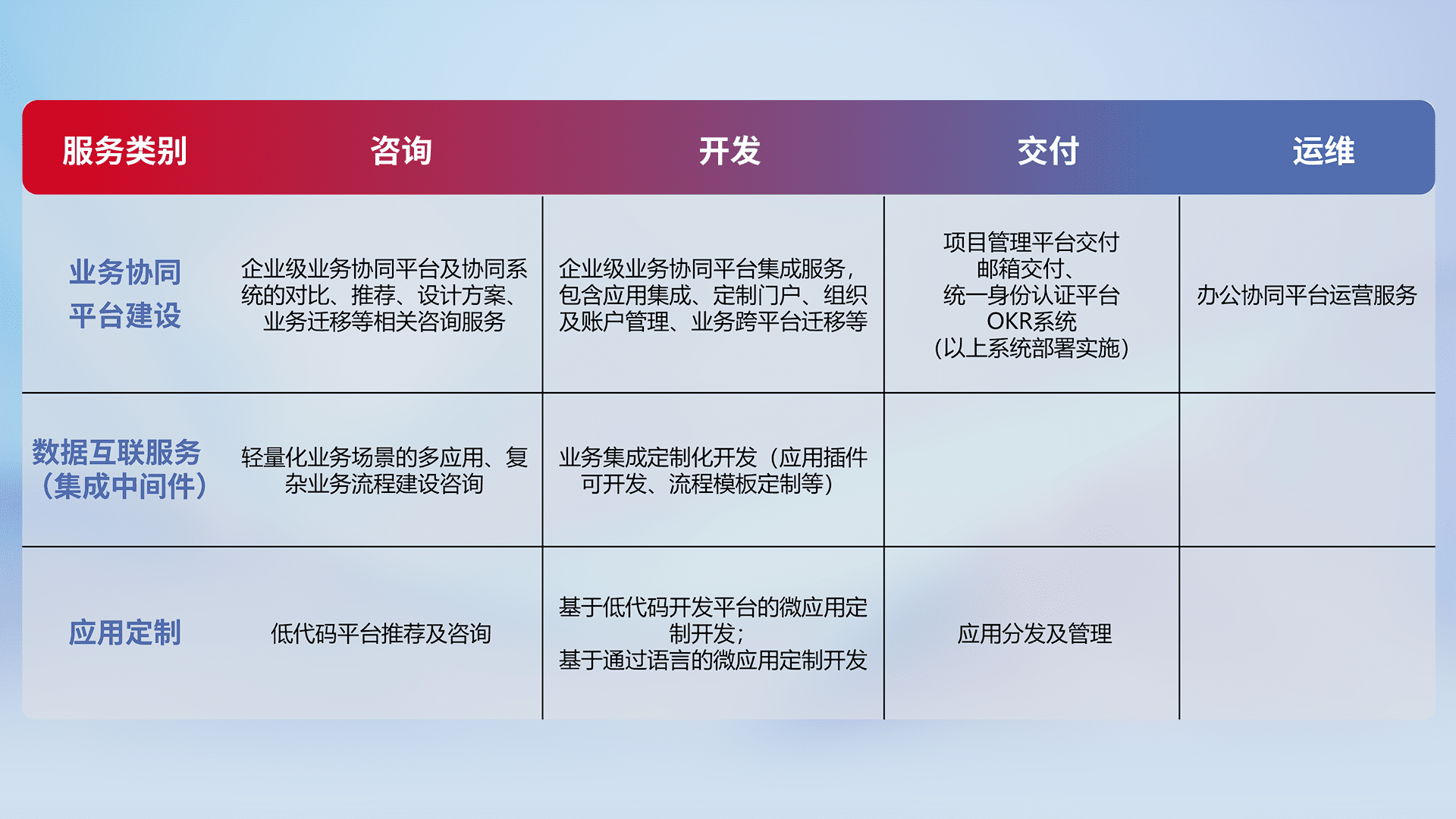 针对钉钉、、、企微、、IDaas等平台级产品提供产品的规划、、、、方案、、交付、、定制化开发等服务,,,,实现如统一协同办公、、、智能客户服务、、、混合会议管理、、、智能数据查询、、等业务场景,,实现数字化转型。。。。
